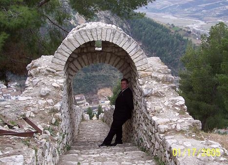 Elder O'Barr in the arch gate to an old castle, high above the valley floor in Albania